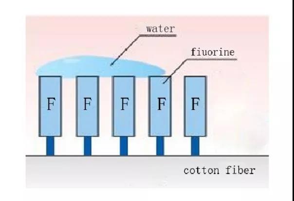 主要是在無紡布或機(jī)織布的表面進(jìn)行覆膜涂層(多為全氟長鏈烷基聚合物),氟系防水劑之所以擁有眾多令人滿意的使用效果,當(dāng)歸功于氟鏈在功能膜的表面以-F在功能膜的最外層,主鏈被很好的包裹在外層氟原子打造的電子云下定向排列的方式成膜,使得含氟化合物在染整過程中對空氣的界面能低,達(dá)到完美“三防”效果。