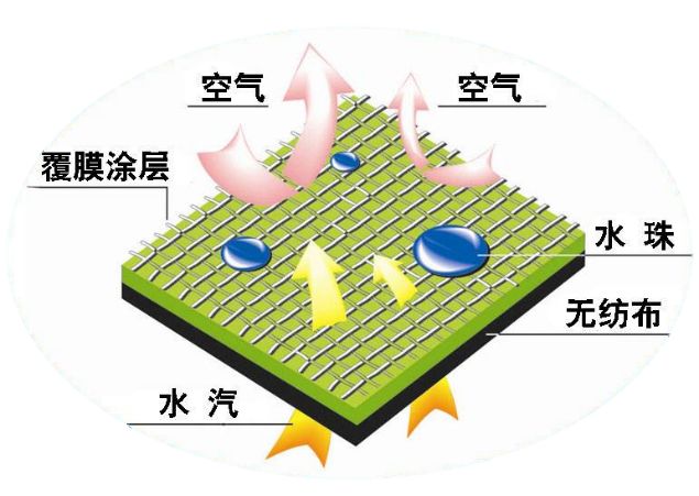 含氟薄膜微孔直徑約在2um左右,水蒸氣的分子只有0.0004um,薄膜的孔徑比水蒸氣直徑大5000倍,水蒸氣可以順利通過薄膜微孔;而毛毛雨的直徑有400μm,比薄膜的微孔直徑大200倍,因此雨滴不能透過薄膜微孔,達(dá)到很好的“三防”功能。