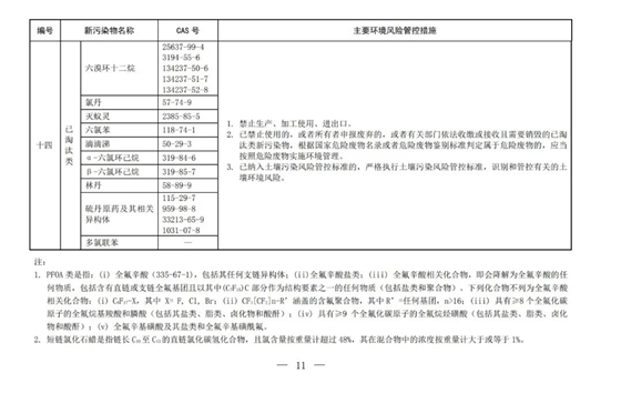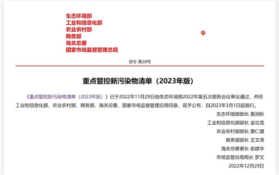 2022年12月29日,生態(tài)環(huán)境部與其它幾個(gè)部委共同發(fā)布了《重點(diǎn)管控新污染清單(2023)版》。清單上包括14種重點(diǎn)管控新污染物,包括·10種持久性有機(jī)污染物(POPs), 2種有毒有害污染物,1種環(huán)境內(nèi)分泌干擾物和1種抗生素。新的清單將于2023年3月1日起正式施行。