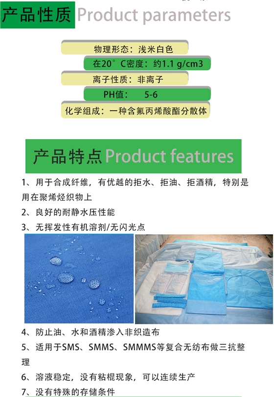 ZJ-PA無(wú)紡布三抗整理劑是具有優(yōu)異的防水、防油、抗酒精效果的含氟整理劑,主要用于手術(shù)衣、手術(shù)洞巾、手術(shù)鋪單、手術(shù)包等無(wú)紡布做三抗整理。