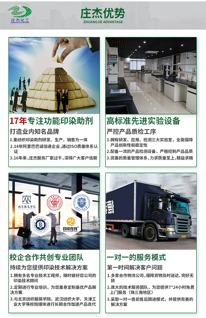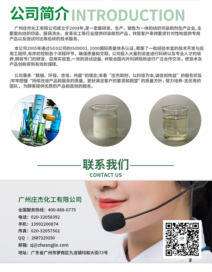 廣州莊杰化工有限公司成立于2004年,是一家集研發(fā)、生產(chǎn)、銷售為一體的紡織印染助劑生產(chǎn)企業(yè),主要面向紡織印染、服裝洗水、皮革化工等行業(yè)提供印染助劑產(chǎn)品,并按客戶來樣要求針對(duì)性地提供專用產(chǎn)品以及測試對(duì)比等后續(xù)的技術(shù)服務(wù)。